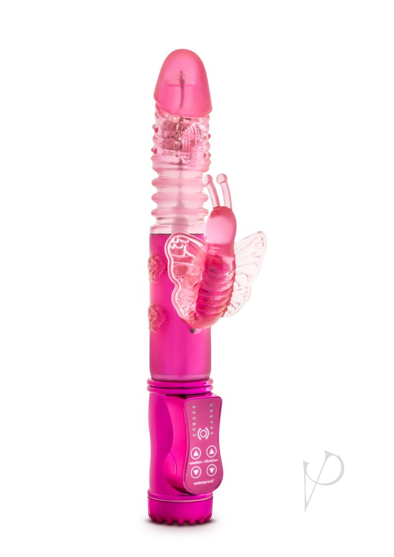 This Butterfly Thruster Mini is anxious to flick, flutter, vibrate and thrust its way straight to your heated cocoon! Featuring reversible rotating pleasure beads and soft sensual gyrating and thrusting shaft, oh don`t forget the monarch of a butterfly vibrating your clit! This vibe boosts three times the endless erotic possibilities yet to cum and just screams, come play with me. Made of a Phthalate free soft jelly tpe and is splash proof for quick and easy cleaning. This Butterfly Thruster Mini is just waiting to make butter of your thighs! Requires 4 AAA batteries, not included. We recommend storing your toys in our Safe Sex Antibacterial Toy Bags