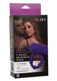 Double your pleasure when you slip on the Silicone Rechargeable 5 Bead Maximusandreg; Ring. This stretchy ring is lined with daring pleasure beads and topped with a nubbed teaser that shakes to the rhythm of 12 functions of vibration.The plush body-safe silicone ring works to improve stamina and girth to make your lover moan for more, more, more. The stretchy ring is lined with 5 beads to maximize sensitivity and elevate sensation throughout the penis to let you enjoy longer, more powerful pleasure. While you reach next level pleasure, the 12 vibration functions and studded teaser will leave your partner in a state of orgasmic bliss.The sensually studded stimulator delivers pinpoint pleasure to your most intimate sweet spots. Take this waterproof ring for a dip and embrace those powerful vibrations in the bath or shower. This passionate cock ring remembers exactly how you like it with the state-of-the-art memory chip and can pick up on the last function used. Use the easy-touch silicone button to effortlessly control pleasure. Recharge your pleasure in no time with a charge time of 1.5 hours.