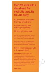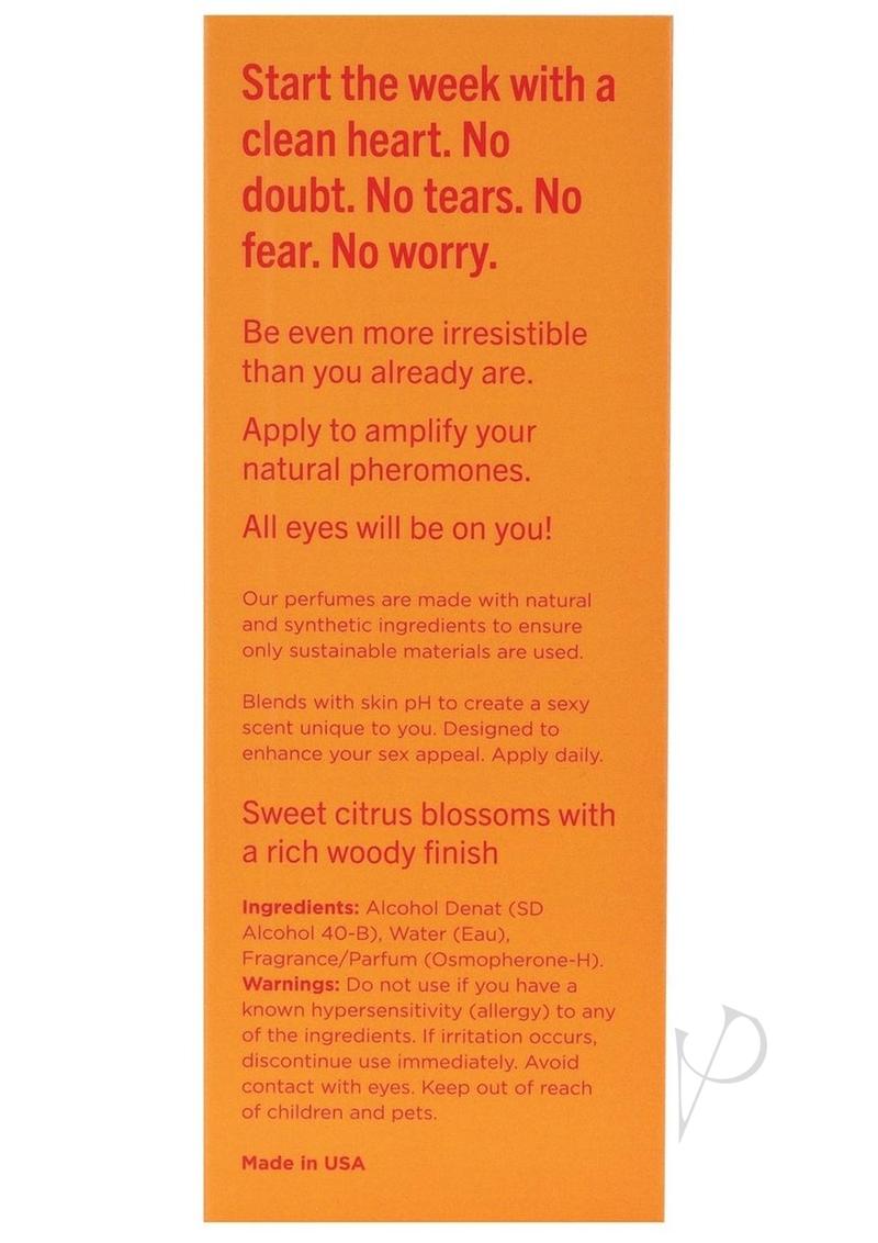 Sweet citrus blossoms with a rich woody finish. Top Notes: Citrus accord, orange blossom, luscious william pear. Mid Notes: Pearl tuberose accord, white gardenia, sambac jasmine. Bottom Notes: Crystal amber, blonde cedarwood, warmed benzoin. Start the week with a clean heart. No doubt. No tears. No fear. No worry. Be even more irresistible than you already are. Apply to amplify your natural pheromones. All eyes will be in you! Hold fragrance 5-7 inches away from skin and apply to pulse points. Blends with skin pH to create a sexy scent unique to you. Designed to enhance your sex appeal.
