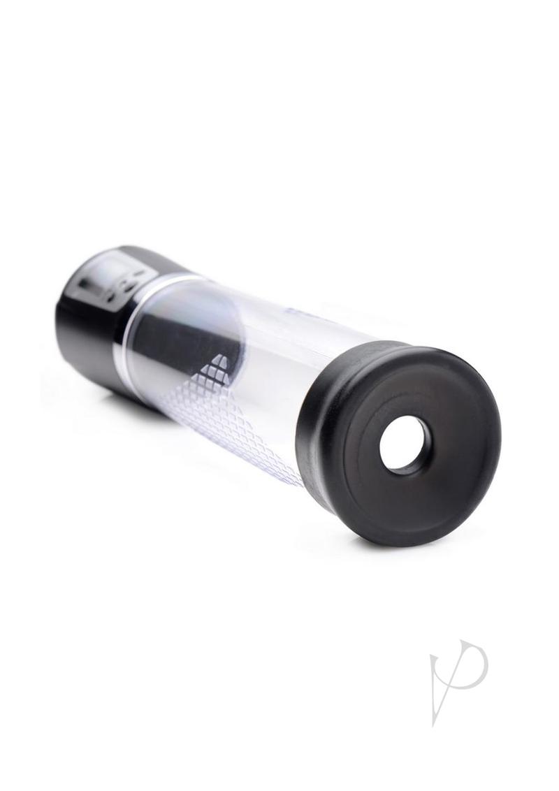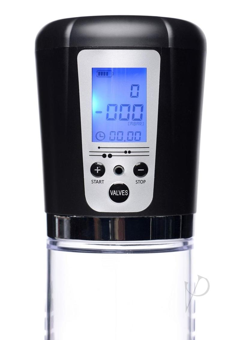 This high-tech penis pump allows you to keep track of the pressure within the cylinder, battery life, and length of your pumping session! Achieve a bigger, harder, and more sensitive boner!Slide into the silicone sleeve using a little water-based lube for sleekness. The tight opening will create a seal around your penis so that pressure can build within. The cylinder is textured for a firm grasp, clear so that you can watch yourself grow, and marked with measurements so that you can track your progress!Explore 4 levels of suction, finding your perfect amount of pressure with the plus and minus buttons. The LED display will tell you the level of internal pressure you are vacuuming your penis with, as well as the battery life and session duration. When you have had enough, a pressure release valve button will release the pressure so that you can play with your erection!Measurements:11.5 inches in total length, 8 inches insertable cylinder depth, 2.35 inches in diameter. Silicone opening is .75 inches in diameter, unstretched. Hose is 8.75 inches in length.Material: ABS, SiliconeColor: ClearNote: Charges via USB