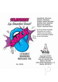 Take your partner on a tantalizing flavor journey with Smack Warming and Lickable Massage Oil. Engage in a tasty and playful massage experience in six delectable flavors: Blue Raspberry, Cherry, Passion Fruit, Peach, Strawberry andamp; Tropical. Smack comes in a 2oz bottle with a convenient leakproof disk cap.