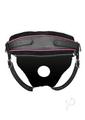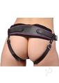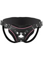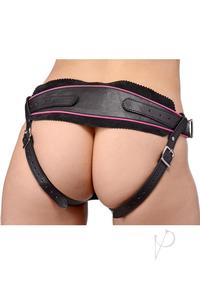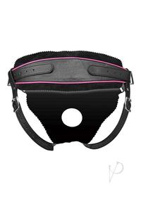 This vegan-friendly strap on harness has exciting pink accents and a low-cut designed to help draw their eye and keep their attention fixed on you. The belt is fully adjustable, with buckles at the hips and rear straps for a tight fit. The back is wide for more support, and lined with soft fabric for comfort. The front has an easy snap-in feature. Using one of the two included steel O-rings, you can add your favorite dildo, with multiple size options. The open-back design still leaves everything open for easy access.Measurements:43 inches in circumference at widest point, fits dildos up to 1.65 inches in diameter.Material:andnbsp;Leatherette, MetalColor:andnbsp;BlackNote:andnbsp;Dildo not included.