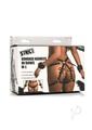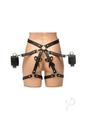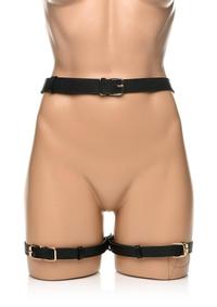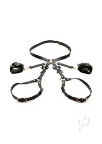 The use of your body is a gift; treat it like one with this bondage harness and wrap up your waist, thighs and wrists like a nice, little package -it even has bows included! Made out of durable PU faux leather, it is vegan friendly and easy to spot clean or wipe clean after each use. The wrist cuffs close using nickel-free, gold colored metal buckles. Adjust the buckles on the thigh straps, waist strap and wrist cuffs for a custom and comfortable fit. Accentuate your curves and make your partner drool with lust and desire as you present yourself as the object of their admiration, a bound and submissive playmate ready to spice up the night!Strap yourself in or, even better, have your partner put their restraints on you! As each buckle tightens a strap, enjoy the feeling of being bound. Even symbolically, your mind may start to shift into being submissive and receptive to wonderful, delicious and deviant ideas the two of you can explore! Make sure it isn`t too tight that it constricts your blood flow. With your wrists pulled behind your back by the straps, kneel before your partner as they play the role of Mister, Mistress, Dominant, or even Daddy! Include your favorite toys and proceed with foreplay to really make this scene rich and sensual!After use, spot clean any part of the harness that needs attention with a soft cloth and toy cleaner.Measurements: Waist adjusts from 26 inch to 42 inch circumference.Thighs adjust from 13 inch to 26 inch circumference.Wrist cuffs adjust from 5.75 inch to 10.25 inch circumference.Materials: PU Leather, Metal Color: Black, Gold Key Features:Beautiful Bondage: Enjoy how this harness restrains your waist, thighs and wrists with straps and wrist-cuffs. Added to the design are little bows that accent the backs of your thighs!PU Leather: Made out of vegan-friendly, durable, PU faux leather. Spot clean as needed.Adjustable Buckles: All straps are adjustable via the buckles and holes.Nickel-Free Metal: Metal used is nickel-free and body-safe.