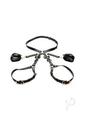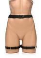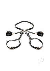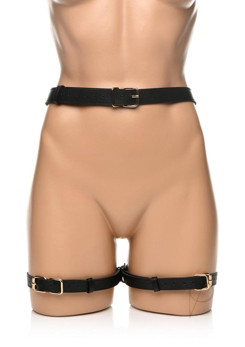 The use of your body is a gift; treat it like one with this bondage harness and wrap up your waist, thighs and wrists like a nice, little package -it even has bows included! Made out of durable PU faux leather, it is vegan friendly and easy to spot clean or wipe clean after each use. The wrist cuffs close using nickel-free, gold colored metal buckles. Adjust the buckles on the thigh straps, waist strap and wrist cuffs for a custom and comfortable fit. Accentuate your curves and make your partner drool with lust and desire as you present yourself as the object of their admiration, a bound and submissive playmate ready to spice up the night!Strap yourself in or, even better, have your partner put their restraints on you! As each buckle tightens a strap, enjoy the feeling of being bound. Even symbolically, your mind may start to shift into being submissive and receptive to wonderful, delicious and deviant ideas the two of you can explore! Make sure it isn`t too tight that it constricts your blood flow. With your wrists pulled behind your back by the straps, kneel before your partner as they play the role of Mister, Mistress, Dominant, or even Daddy! Include your favorite toys and proceed with foreplay to really make this scene rich and sensual!After use, spot clean any part of the harness that needs attention with a soft cloth and toy cleaner.Measurements:Waist adjusts from 35 inch to 52 inch circumference.Thighs adjust from 21.5 inch to 37.5 inch circumference.Wrist cuffs adjust from 5.75 inch to 10.25 inch circumference.Materials: PU leather, metalColor: Black, gold Key Features:Beautiful Bondage: Enjoy how this harness restrains your waist, thighs and wrists with straps and wrist-cuffs. Added to the design are little bows that accent the backs of your thighs!PU Leather: Made out of vegan-friendly, durable, PU faux leather. Spot clean as needed.Adjustable Buckles: All straps are adjustable via the buckles and holes.Nickel-Free Metal: Metal used is nickel-free and body-safe.