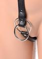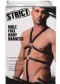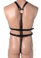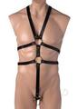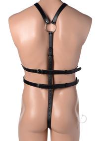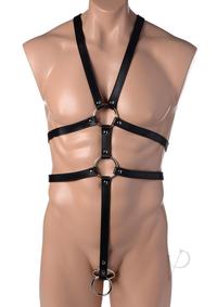 Strap into this full-body harness, designed to wrap seductively around your body and cock! Three adjustable straps ensure that this sexy bondage accessory fits most male bodies, with two cock rings that allow you to put your entire package through one, and just your cock through the other. Loom intimidatingly over your lover in this unique harness, or service your Master or Mistress. This device is perfect for those who fall into either Dominant or submissive roles.Measurements:Chest strap has a maximum circumference of 54 inches.Waist strap has a maximum circumference of 41 inches.Cock ring diameter is 1.75 inches.Cock and ball ring has a diameter of 2 inches.Material: PU Leather, MetalColor: Black