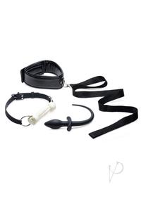 Everything you need to let out your inner puppy is included in this Puppy Play Set! This versatile set contains a silicone bone gag, flexible tail butt plug, and cushioned adjustable collar use every item at once for a wild romp or use each item on its own for a more subtle way to puppy play.This set is made with high quality ingredients for a durable and body safe experience every session! The premium silicone bone gag is firm and satisfying to bite down on, and adjustable to fit most head sizes. The real star of this kit is the flexible silicone doggy tail butt plug perfectly sized for most anal skill levels, and flexible for long term play! The cushioned collar is comfortable on the neck and fully adjustable, and pairs with an included 42 inch leash for a walk around the home.The tail and bone gag are made with phthalate free silicone for a worry free, body safe session. Clean before and after use with warm water and mild antibacterial soap. Compatible with water based lubricants, avoid use with silicone lubes.Measurements:Gag measurements: Overall length: 25.5 inches, bone length 5.4 inches, bone diameter 1 inch, gag adjusts from 18.5 inches to 23.5 inches in circumference.Plug+Tail measurements: Overall length 12.1 inches, plug length 3.6 inches, tail length 8.5 inches, plug widest diameter 1.2 inchesCollar measurements: Overall length 21 inches, collar width 2.25 inches, collar adjusts from 15.5 inches to 19.5 inchesLeash measurements: 42.5 inchesMaterials: Silicone, PU Leather, Metal, NylonColor: Black collar, leash, and plug+tail. White bone bit.