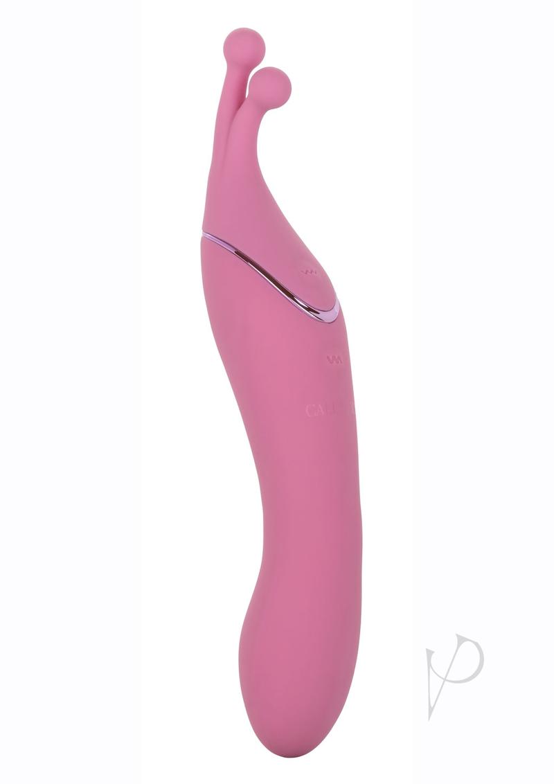 2-in-1 massager with mind-blowing power. G-spot tip with 7 speeds of vibration. Two flickering teasers with 7 speeds of vibration. Dual sided with independently operated motors. Body-safe Silicone. State-of-the-art memory chip resumes on last speed used. Easy push-button control hold for 3 seconds to turn on or off. USB rechargeable charging cord included. Complete charge in 2 hours. Runs for 60 minutes on high speed and 90 minutes on low speed.
