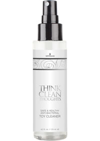 Keep your pleasure products clean and your body safe! Think Clean Thoughts is a quick and simple-to-use antibacterial cleaning spray that contains active anti-microbial ingredients proven to kill 99.9% of all germs, and it is mild enough to not cause irritation to delicate tissue. – Spray directly onto pleasure products both prior to use, and afterward. Wipe away extra fluid. Not intended as a personal moisturizer (do not use internally). – Made with healthy ingredients such as: water, witch hazel extract, organic aloe vera, grape seed extract, sweet orange and other true essential oils. – No parabens, petrochemicals, or glycerine.