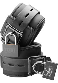 These Neoprene wrist cuffs are adjustable, comfortable, and come with a Tom of Finland brand lock and two keys. The double layered material is stamped with a metal Tom of Finland logo. Fully adjustable and ideal for long term wear. Matching collar and ankle cuffs available, sold separatelyMeasurements:Adjustable from 11 to 14 inches in length, 2.25 inches in width.Material:andnbsp;Neoprene, Metal, PlasticColor:andnbsp;BlackNote:andnbsp;Includes lock and two keys. Free collector print included!