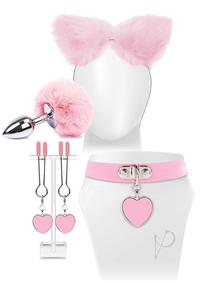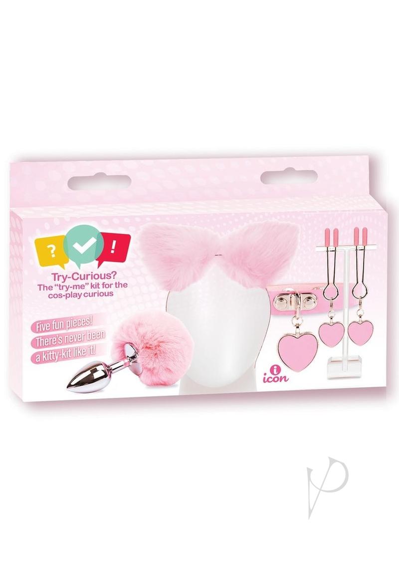Cos-play or foreplay, the Kitty Kit might be the most fun you can have with a cotton tail and furry ears! It`s Icon Brands` five-piece fun kitwith big, pink kitty ears, a sexy conntontail butt plug, a pink leatherette collar with a pink leatherette heart and because they`re a kinky little kitty, two beautiful couture clips that drip matching pink leatherette hearts from her erect nipples. The butt plug is silvered for non-porous sterility, the nipple clips are variable pressure for just the right pain/pleasure mix, and the collar is adjustable of course. Turn that bedroom into a playroom with the kits that really turning headseven if they do have big pink ears! It`s the Kitty Kit, only from Try-Curious by Icon.